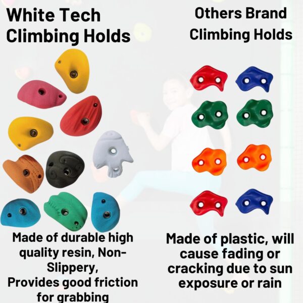 • ✅ High Quality – Unlike the cheap plastic outdoor kids climbing holds that are on the market, our premium rock climbing holds are made with the highest quality fiberglass and resin materials, which are durable and weather resistant.